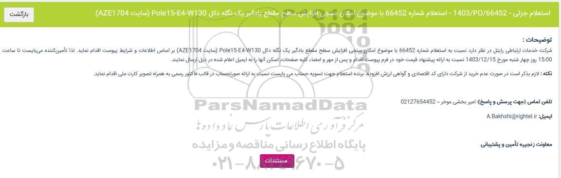 استعلام جزئی - 1403 / PO.66452 - استعلام شماره 66452 با موضوع امکان سنجی افزایش سطح مقطع بادگیر یک نگله دکل MW 1403/POle 15-E4-) W130/66483 (سایت AZE1704)