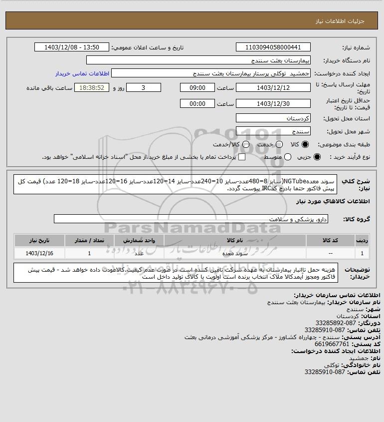 شرح کلی نیاز: سوند معدهNGTube(سایز 8=480عدد-سایز 10=240عدد-سایز 14=120عدد-سایز 16=120عدد-سایز 18=120 عدد) قیمت کل پیش فاکتور حتما بادرج کدIRC پیوست گردد.