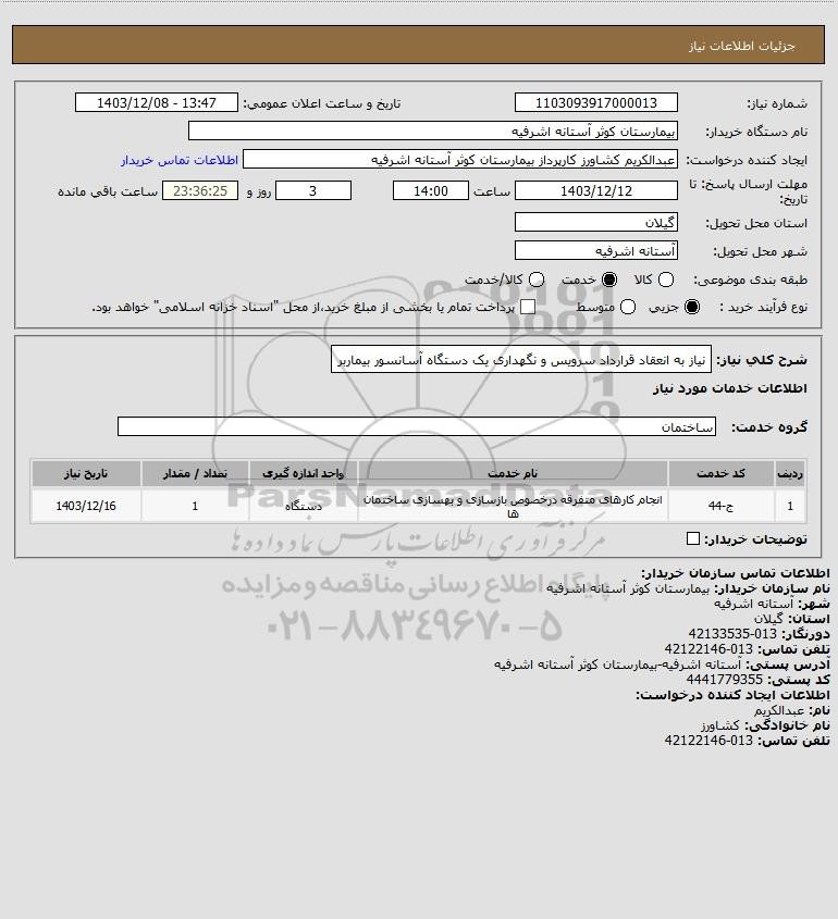 شرح کلی نیاز: نیاز به انعقاد قرارداد سرویس و نگهداری یک دستگاه آسانسور بیماربر