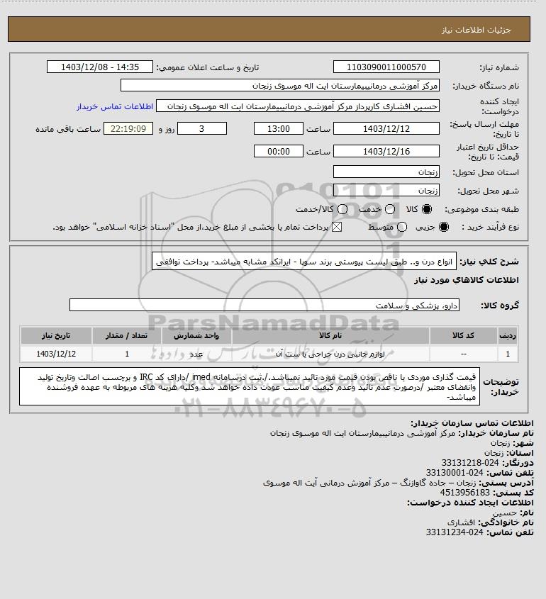 | 1 | -- | لوازم جانبی درن جراحی یا ست آن | عدد | 1 | 1403/12/12 |