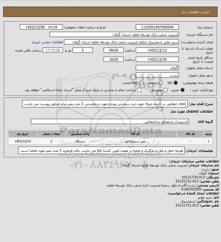 شرح کلی نیاز: کالای اعلامی در جدول صرفا جهت ثبت سفارش بوده و مورد درخواستی 2 عدد پمپ برابر تصاویر پیوست می باشد.