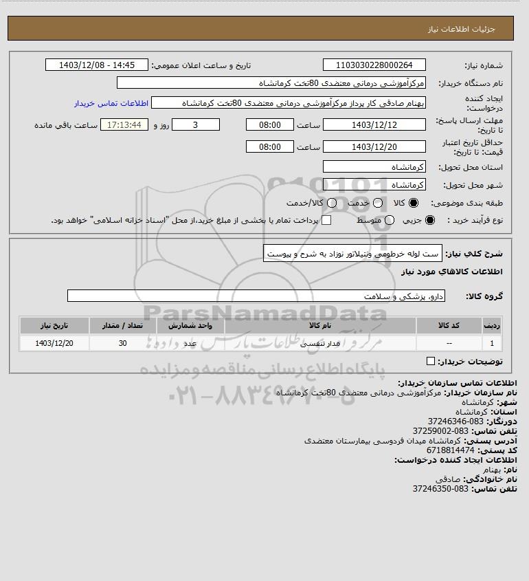 شرح کلی نیاز: ست لوله خرطومی ونتیلاتور نوزاد به شرح و پیوست