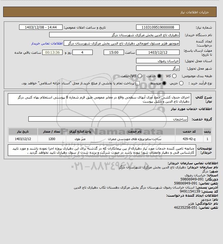 شرح کلی نیاز: اجرای جدول کشی جمع آوری آبهای سطحی واقع در معابر عمومی طبق فرم شماره 8 پیوستی استعلام بهاء کتبی درگز دهیاری تاج الدین و دیتیل پیوست
