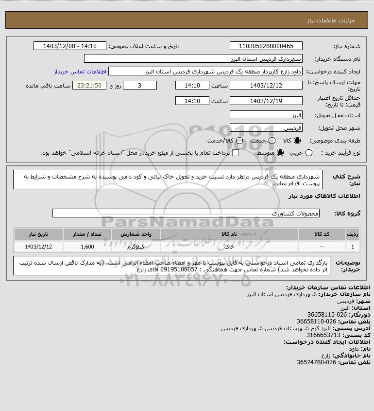 شرح کلی نیاز: شهرداری منطقه یک فردیس درنظر دارد نسبت خرید و تحویل خاک نباتی و کود دامی پوسیده به شرح مشخصات و شرایط به پیوست اقدام نماید.