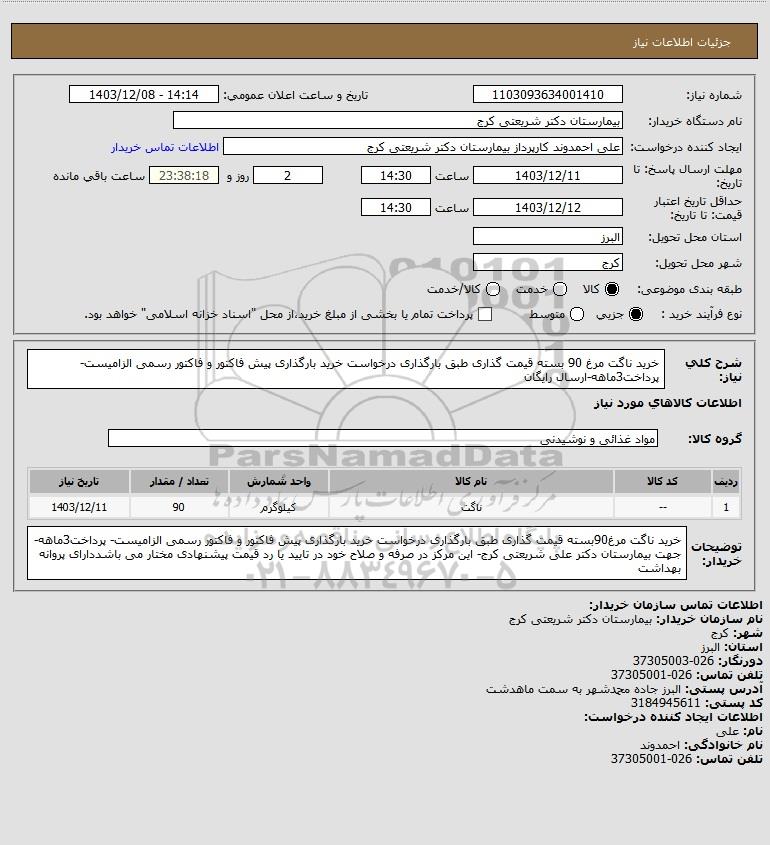 توضیحات خریدار:خرید ناگت مرغ90بسته قیمت گذاری طبق بارگذاری درخواست خرید بارگذاری پیش فاکتور و فاکتور رسمی الزامیست- پرداخت3ماهه-جهت بیمارستان دکتر علی شریعتی کرج- این مرکز در صرفه و صلاح خود در تایید یا رد قیمت پیشنهادی مختار می باشددارای پروانه بهداشت