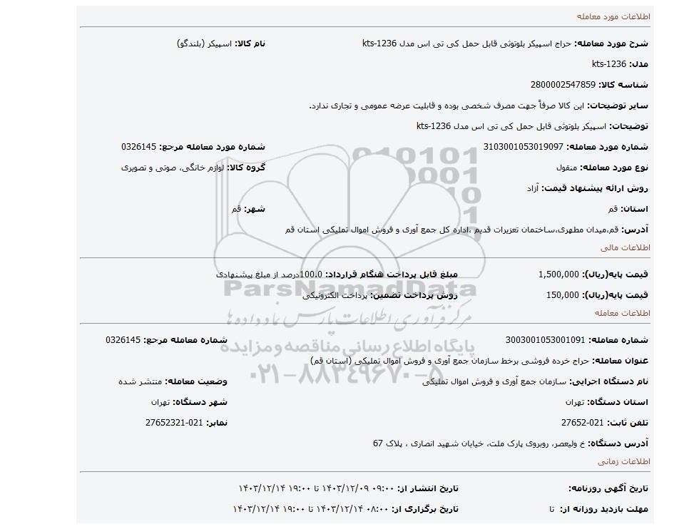 عنوان معامله: حراج خرده فروشی برخط سازمان جمع آوری و فروش اموال تملیکی (استان قم)
