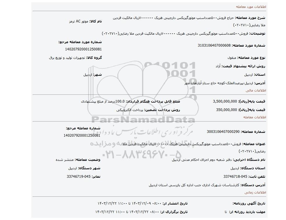 عنوان معامله: فروش۵۰۰عدداستپ موتورگیربکس دارچینی هریک ۷۰۰۰۰۰۰ریال مالکیت فردین ملا رضایی(۰۲۰۲۷۱۰) | ||