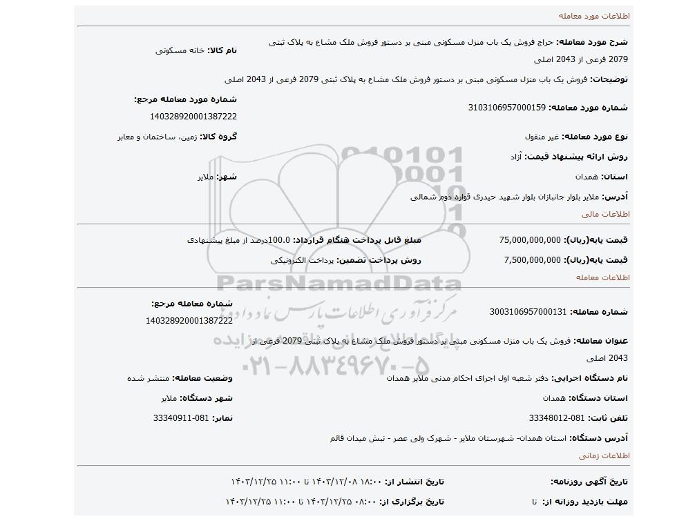 | عنوان معامله: فروش یک باب منزل مسکونی مبنی بر دستور فروش ملک مشاع به پلاک ثبتی 2079 فرعی از 2043 اصلی | ||