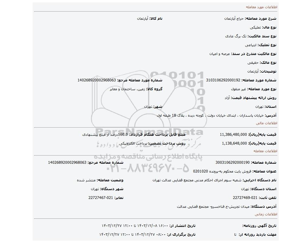 | شرح مورد معامله: حراج آپارتمان | نام کالا: آپارتمان | |