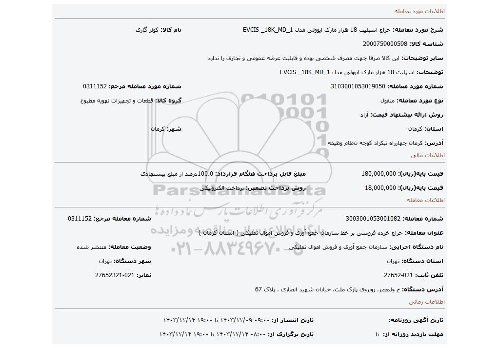 | شرح مورد معامله: حراج اسپلیت 18 هزار مارک ایوولی مدل EVCIS _18K_MD_1 | نام کالا: کولر گازی | |