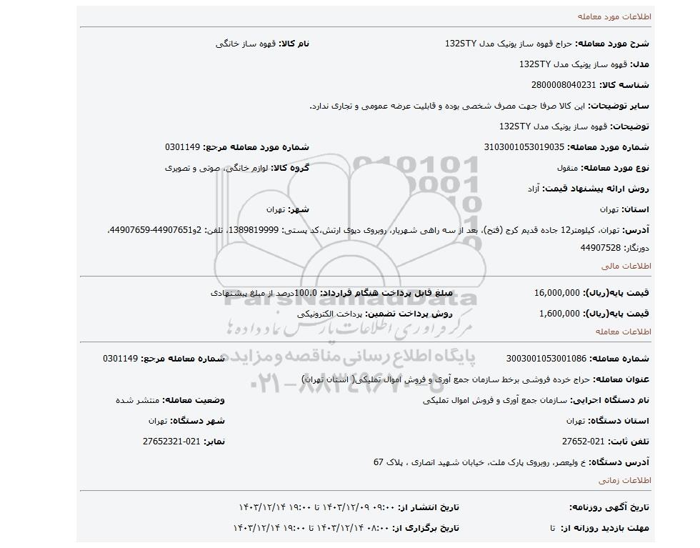 نام دستگاه اجرایی: سازمان جمع آوری و فروش اموال تملیکیوضعیت معامله: منتشر شده