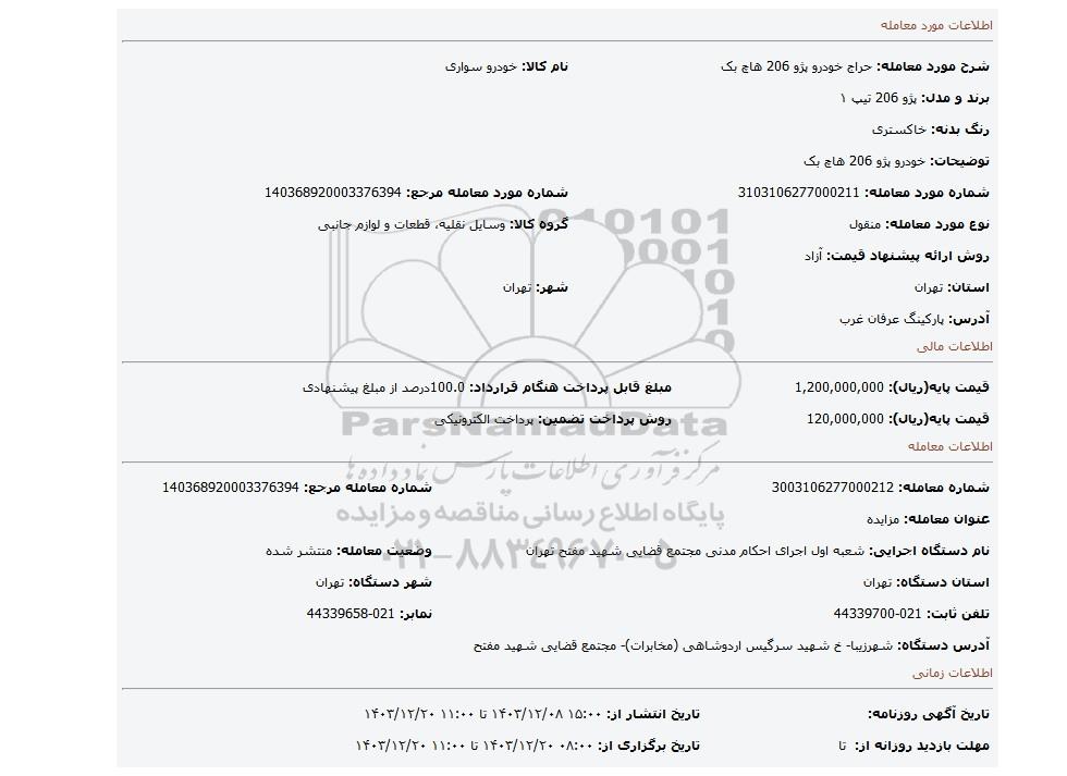 | شماره مورد معامله: 3103106277000211 | شماره مورد معامله مرجع: 140368920003376394 | |