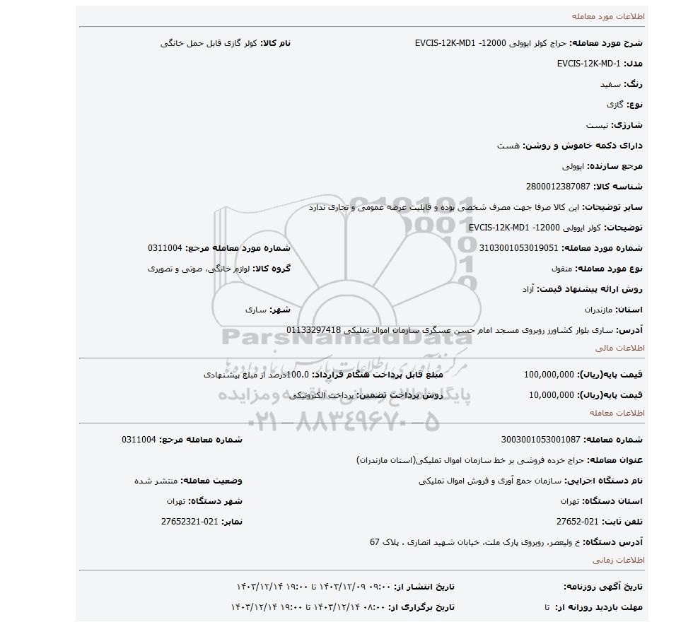 مزایده عمومی کولر ایوولی 12000- EVCIS-12K-MD1 برگزار میگردد. از کلیه افراد متخصص و شرکت‌های واجد شرایط دعوت به عمل می‌آید تا در این مزایده با کد خبرگزاری پارس نماد : 8738224 شرکت نمایند تاریخ شروع مزایده : 1403/12/09 مهلت شرکت در مزایده: تا پایان روز 1403/12/14 مکان برگزاری اموال واگذاری استان‌های مازندران و دسته‌بندی‌های مربوط به این حراجی تاسیسات, متفرقه میباشد.