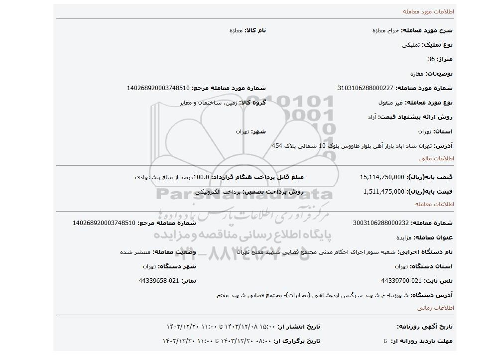 | شماره مورد معامله: 3103106288000227 | شماره مورد معامله مرجع: 140268920003748510 | |