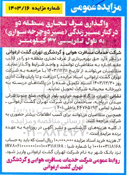 شرکت خدمات مسافرت هوایی و گردشگری تهران گشت ارغوانی در نظر دارد حق بهره برداری از غرف تجاری منطقه دو را در قالب عقد اجاره به متقاضیان توانمند و واجد شرایط واگذار نماید. متقاضیان می توانند از تاریخ 1403.12.11 با مراجعه به شرکت تهران گشت ارغوانی، اسناد مزایده را دریافت و تا پایان وقت اداری روز 1403.12.20 اسناد تکمیل شده را در پاکتهای دربسته به دبیرخانه محرمانه شرکت تحویل نمایند.