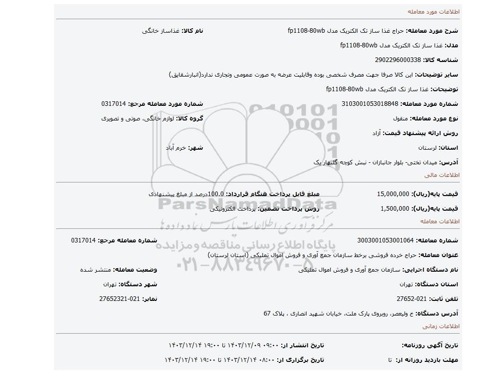 عنوان معامله: حراج خرده فروشی برخط سازمان جمع آوری و فروش اموال تملیکی (استان لرستان)