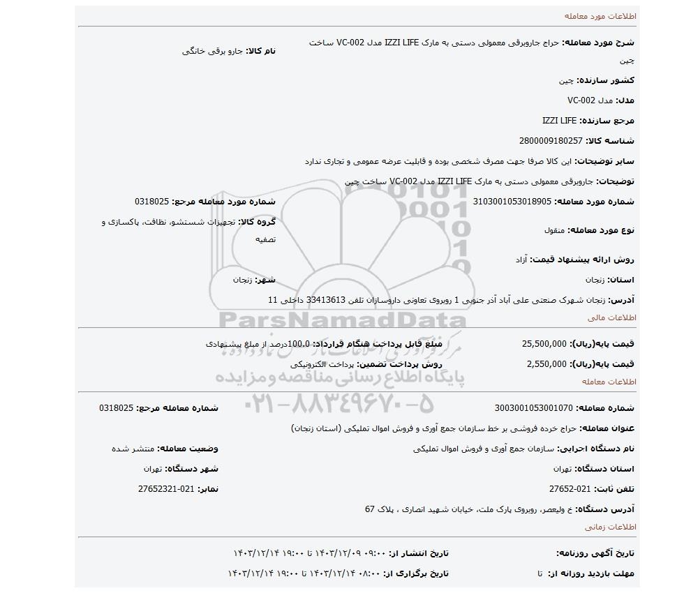 مزایده عمومی جاروبرقی معمولی دستی به مارک IZZI LIFE مدل VC-002 ساخت چین برگزار میگردد. از کلیه افراد متخصص و شرکتهای واجد شرایط دعوت به عمل میآید تا در این مزایده با کد خبرگزاری پارس نماد : 8738265 شرکت نمایند تاریخ شروع مزایده : 1403/12/09 مهلت شرکت در مزایده: تا پایان روز 1403/12/14 مکان برگزاری اموال واگذاری استانهای زنجان و دستهبندیهای مربوط به این حراجی متفرقه میباشد.