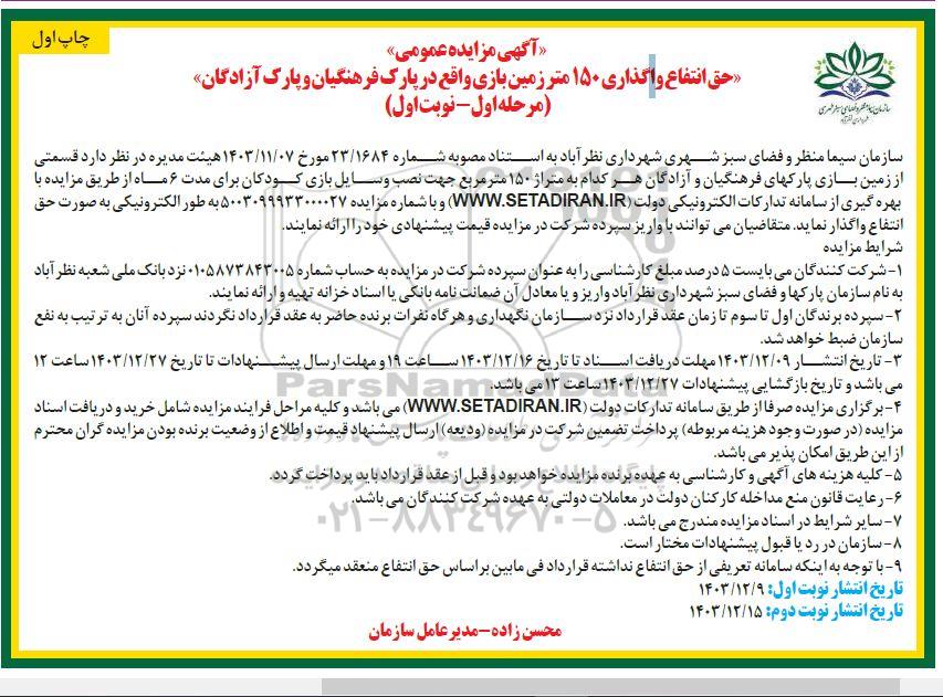 سازمان سیما منظر و فضای سبز شهری شهرداری نظر آباد به استناد مصوبه شماره23.1684 مورخ 1403.11.7 هیئت مدیره در نظر دارد قسمتی از زمین بازی پارکهای فرهنگیان و آزادگان هر کدام به متراژ 150 متر مربع جهت نصب وسایل بازی کودکان برای مدت 6 ماه از طریق مزایده با بهره گیری از سامانه تدارکات الکترونیکی دولت ستاد ایران و با شماره مزایده 5003099933000027 به طور الکترونیکی به صورت حق انتفاع واگذار نماید.