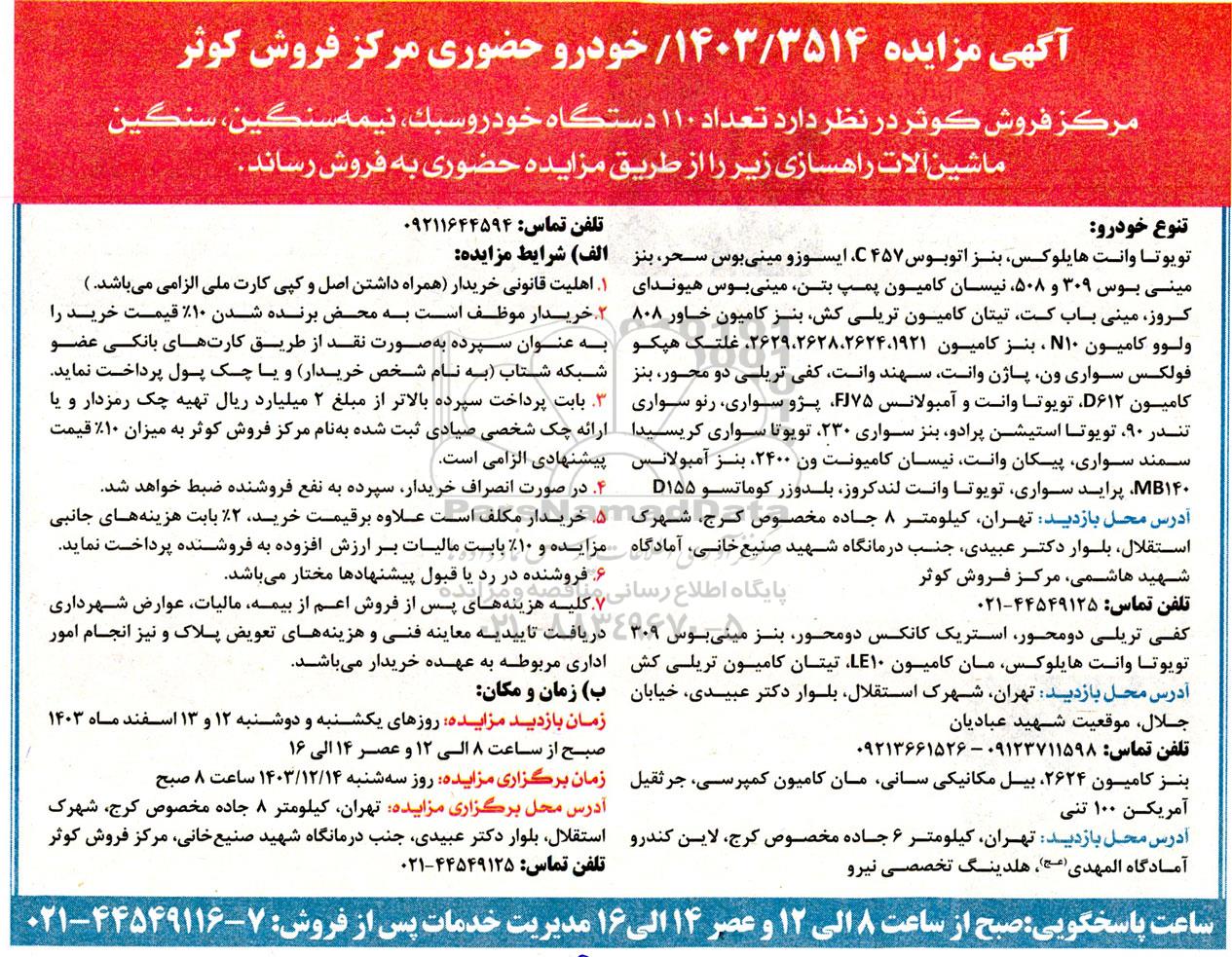 اگهی مزایده 1403.3514 خودرو حضوری مرکز فروش کوثر