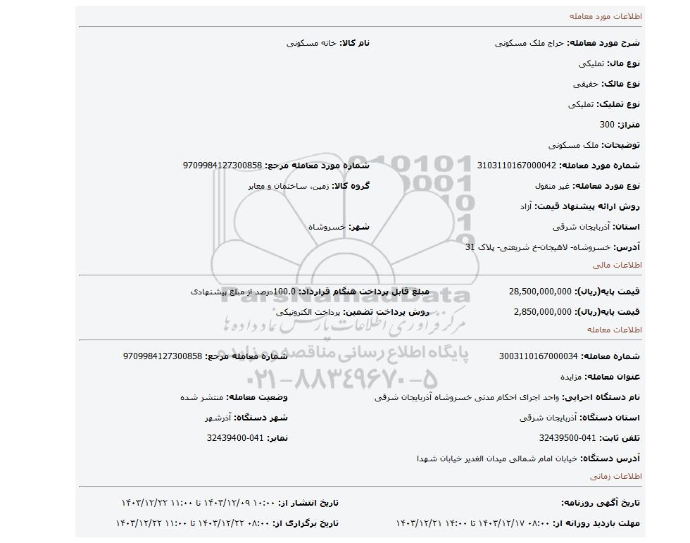 | شماره مورد معامله: 3103110167000042 | شماره مورد معامله مرجع: 9709984127300858 | |