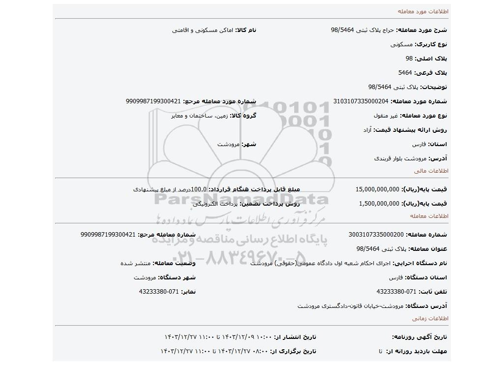 مزایده پلاک ثبتی 98/5464, مزایده، پلاک ثبتی 98/5464