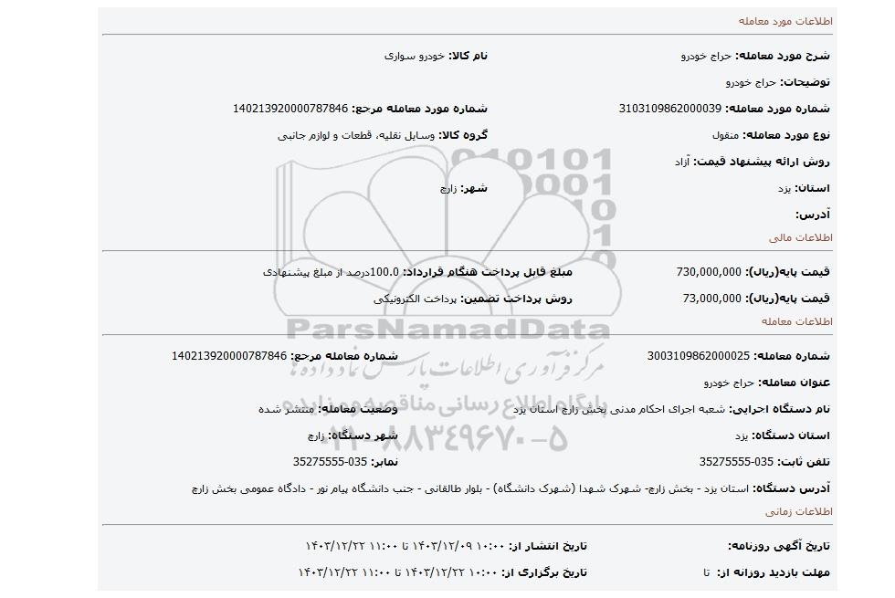 | شماره مورد معامله: 3103109862000039 | شماره مورد معامله مرجع: 140213920000787846 | |