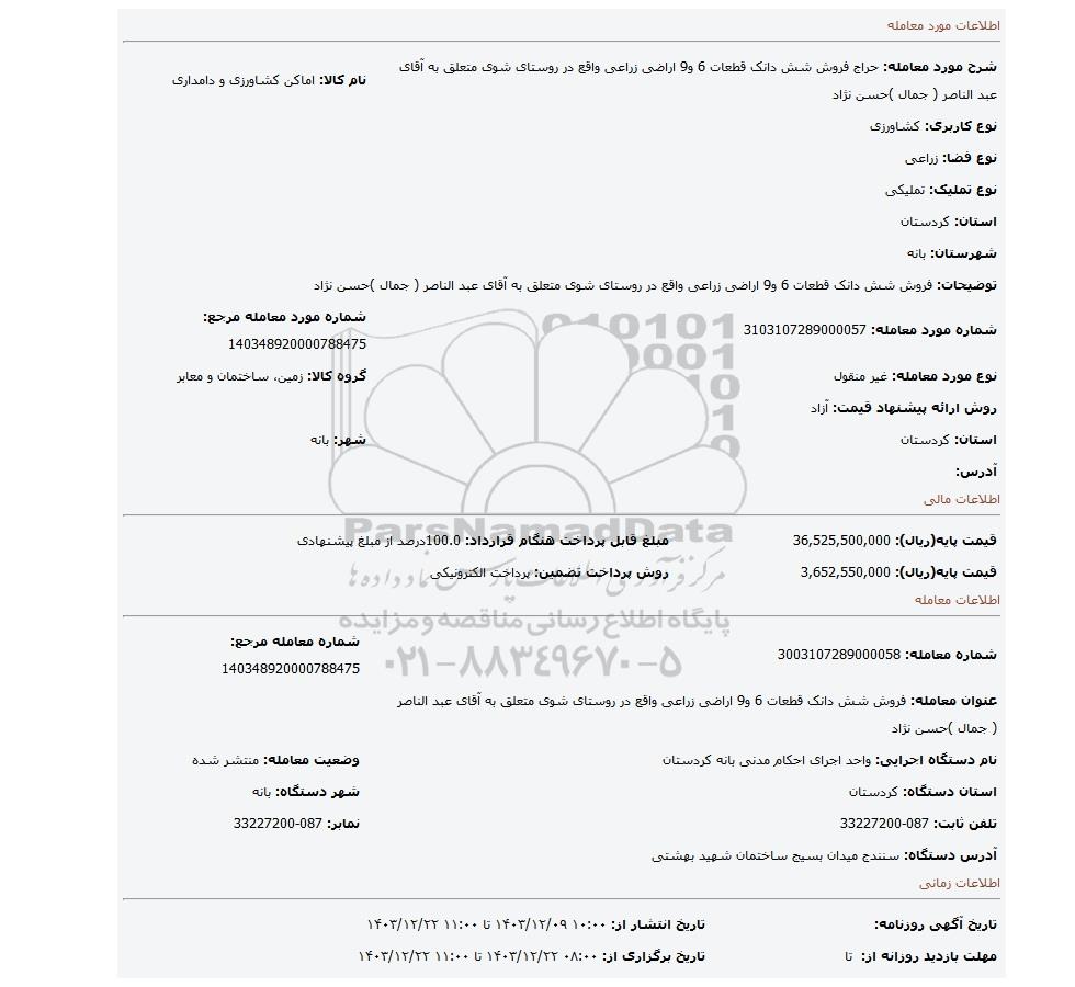 | عنوان معامله: فروش شش دانک قطعات 6 و9 اراضی زراعی واقع در روستای شوی متعلق به آقای عبد الناصر ( جمال )حسن نژاد | ||