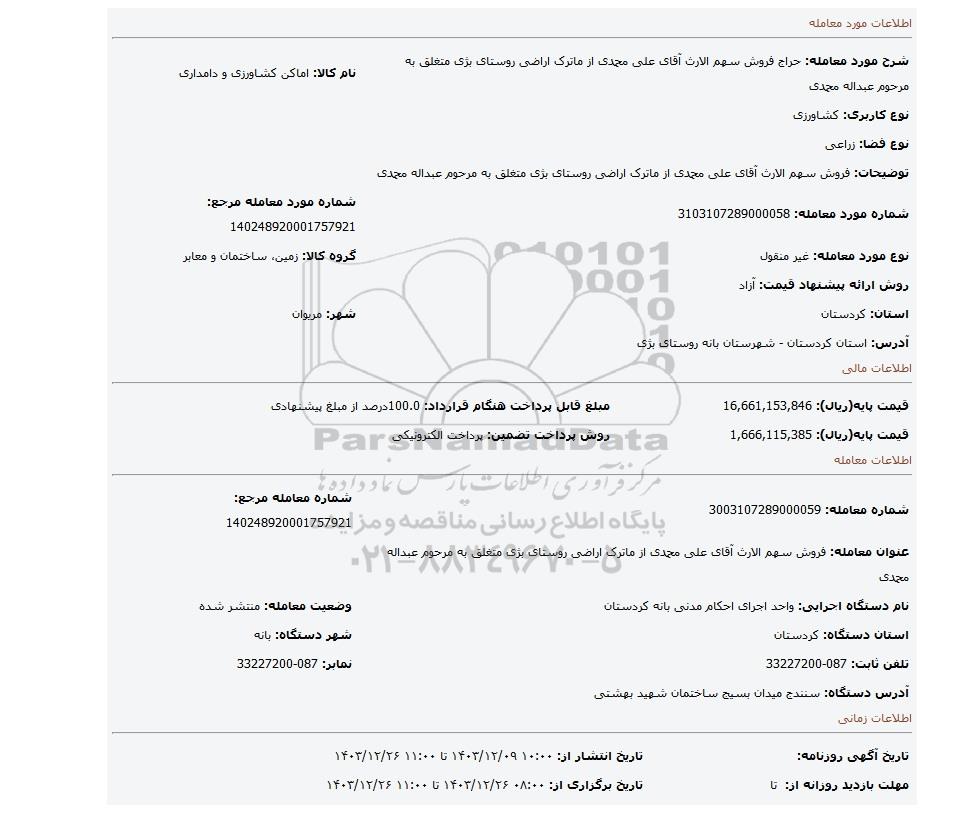 مزایده، فروش سهم الارث آقای علی محمدی از ماترک اراضی روستای بژی متغلق به مرحوم عبداله محمدی