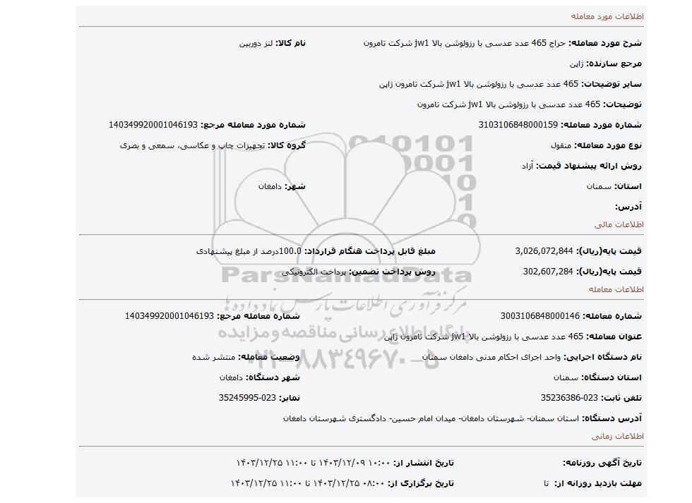 | شماره مورد معامله: 3103106848000159 | شماره مورد معامله مرجع: 140349920001046193 | |