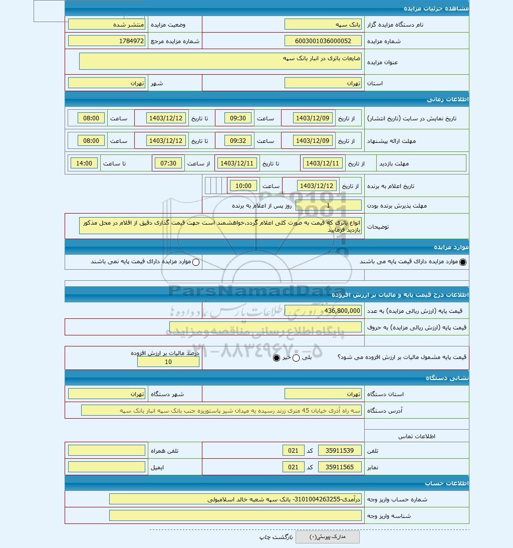 | عنوان مزایده | ضایعات باتری در انبار بانک سپه | |||