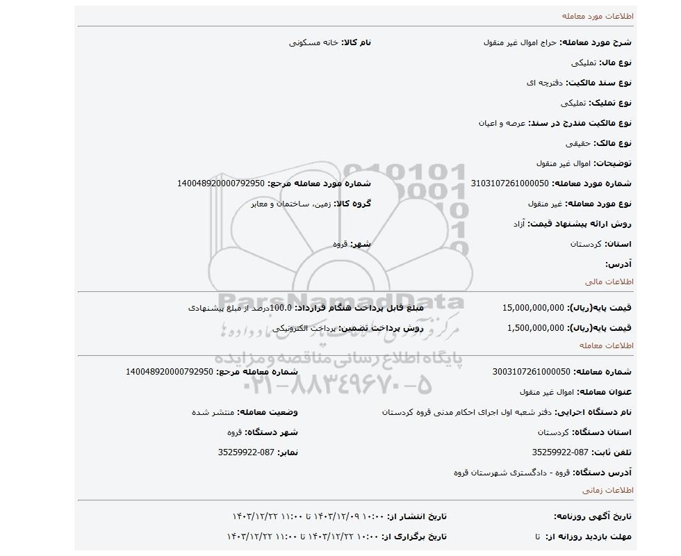 | شرح مورد معامله: حراج اموال غیر منقول | نام کالا: خانه مسکونی | |