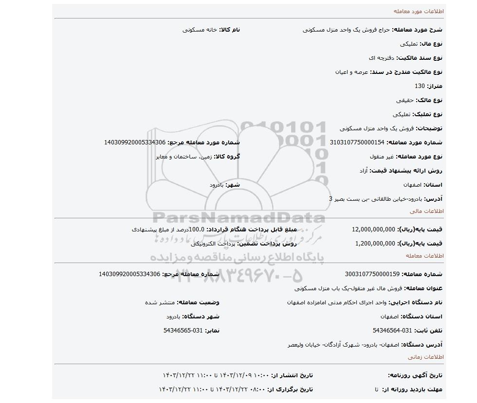 | شرح مورد معامله: حراج فروش یک واحد منزل مسکونی | نام کالا: خانه مسکونی | |