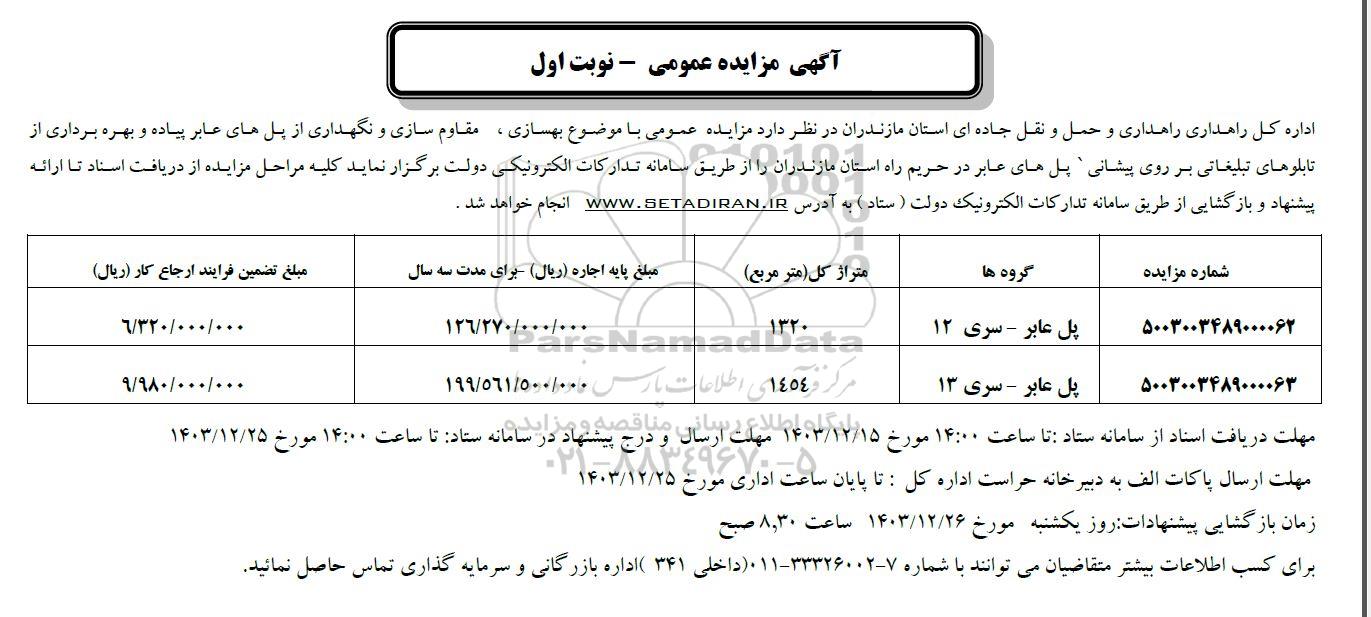 اداره کل راهداری راهداری و حمل و نقل جاده ای استان مازندران در نظر دارد مزایده عمومی با موضوع بهسازی، مقاوم سازی و نگهداری از پل های عابر پیاده و بهره برداری از تابلوهای تبلیغاتی بر روی پیشانی پل های عابر در حریم راه استان مازندران را از طریق سامانه تدارکات الکترونیکی دولت برگزار نماید کلیه مراحل مزایده از دریافت استاد تا ارائه پیشنهاد و بازگشایی از طریق سامانه تدارکات الکترونیک دولت (ستاد) به آدرس ستاد ایران انجام خواهد شد.