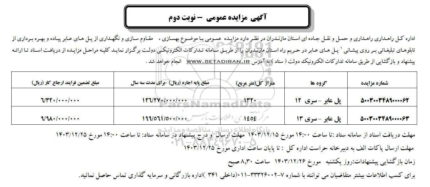 اداره کل راهداری راهداری و حمل و نقل جاده ای استان مازندران در نظر دارد مزایده عمومی با موضوع بهسازی، مقاوم سازی و نگهداری از پل های عابر پیاده و بهره برداری از تابلوهای تبلیغاتی بر روی پیشانی پل های عابر در حریم راه استان مازندران را از طریق سامانه تدارکات الکترونیکی دولت برگزار نماید کلیه مراحل مزایده از دریافت استاد تا ارائه پیشنهاد و بازگشایی از طریق سامانه تدارکات الکترونیک دولت (ستاد) به آدرس ستاد ایران انجام خواهد شد.
