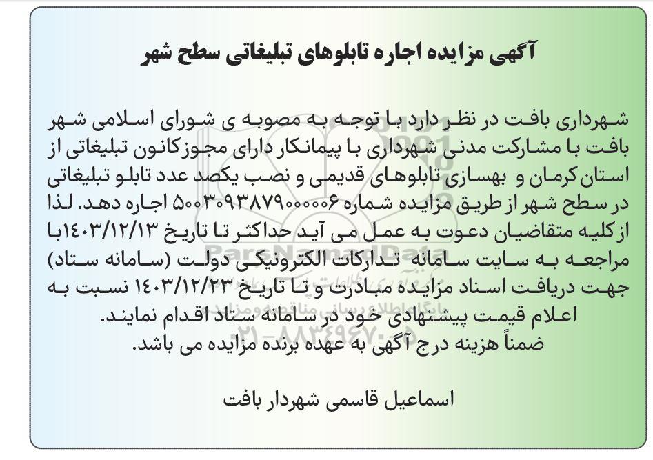 شهرداری بافت در نظر دارد با توجه به مصوبه ی شورای اسلامی شهر بافت با مشارکت مدنی شهرداری با پیمانکار دارای مجوز کانون تبلیغاتی از استان کرمان و بهسازی تابلوهای قدیمی و نصب یک عدد تابلو تبلیغاتی در سطح شهر از طریق مزایده شماره 5003093879000006 اجاره دهد. لذا از کلیه متقاضیان دعوت به عمل می آید حداکثر تا تاریخ 1403.12.13 با مراجعه به سایت سامانه تدارکات الکترونیکی دولت سامانه ستاد جهت دریافت اسناد مزایده مبادرت و تا تاریخ 1403.12.23 نسبت به اعلام قیمت پیشنهادی خود در سامانه ستاد اقدام نمایند.