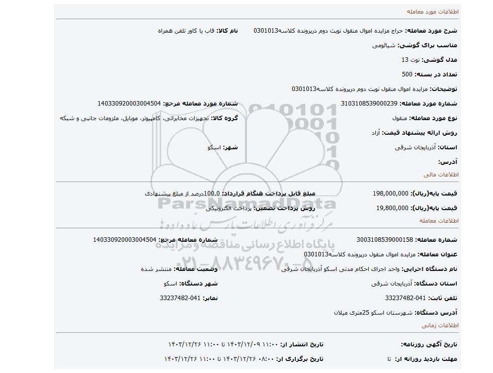 | شرح مورد معامله: حراج مزایده اموال منقول نوبت دوم درپرونده کلاسه0301013 | نام کالا: قاب یا کاور تلفن همراه | |