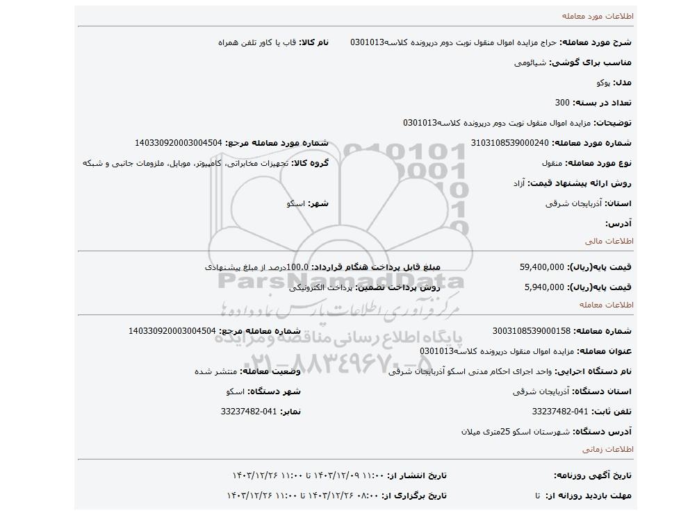 | شرح مورد معامله: حراج مزایده اموال منقول نوبت دوم درپرونده کلاسه0301013 | نام کالا: قاب یا کاور تلفن همراه | |