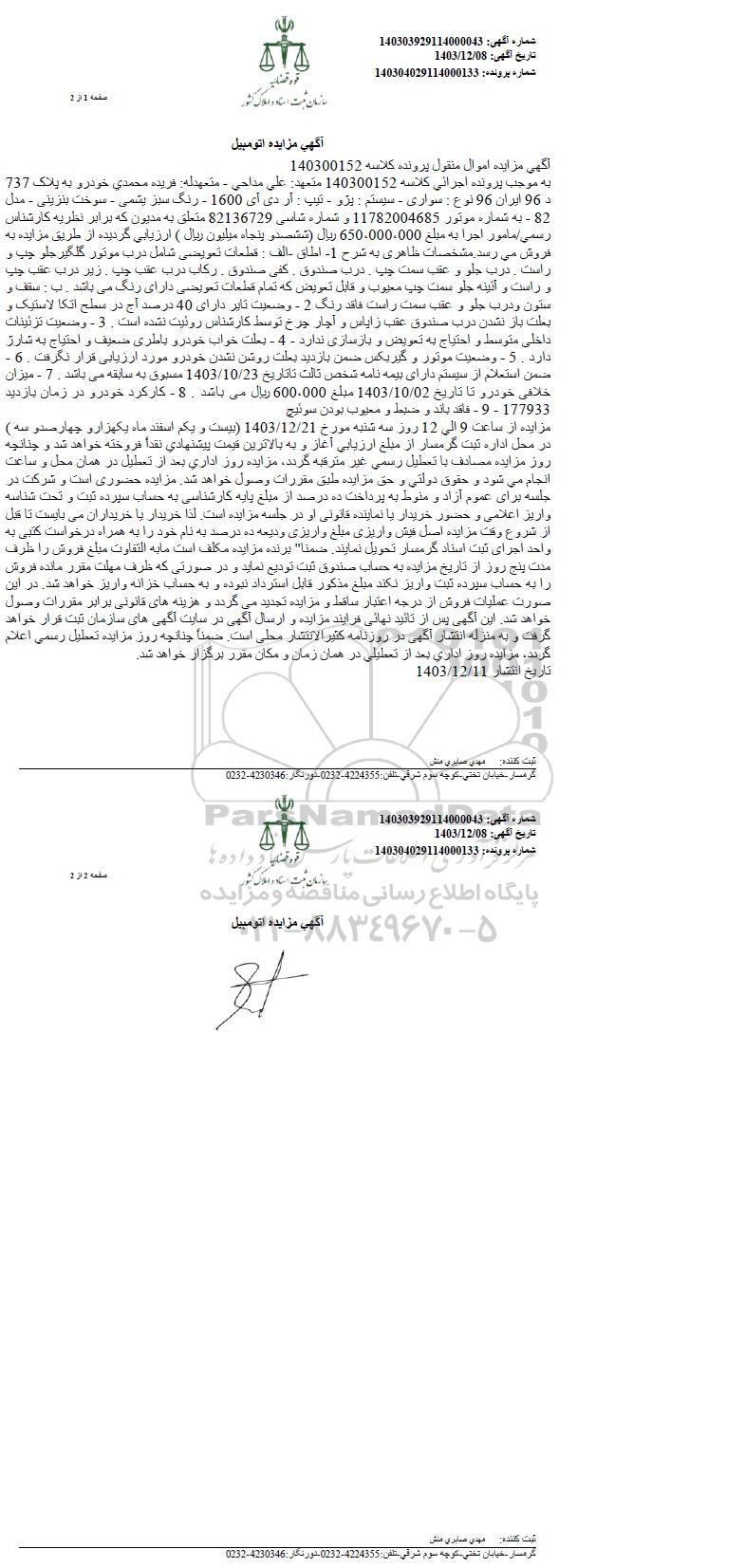 مزایده عمومی مزایده سواری سیستم پژو ار دی 1600 برگزار میگردد. از کلیه افراد متخصص و شرکتهای واجد شرایط دعوت به عمل میآید تا در این مزایده با کد خبرگزاری پارس نماد : 8738967 شرکت نمایند تاریخ شروع مزایده : 1403/12/09 مهلت شرکت در مزایده: تا پایان روز 1403/12/21 مکان برگزاری اموال واگذاری استانهای سمنان و دستهبندیهای مربوط به این حراجی انواع خودرو سبک میباشد.