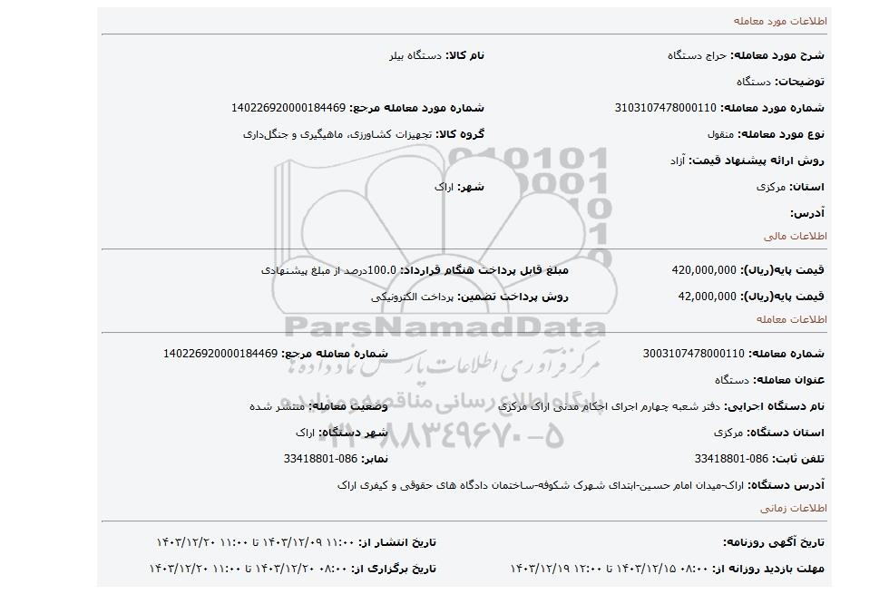 نام دستگاه اجرایی: دفتر شعبه چهارم اجرای احکام مدنی اراک مرکزیوضعیت معامله: منتشر شده