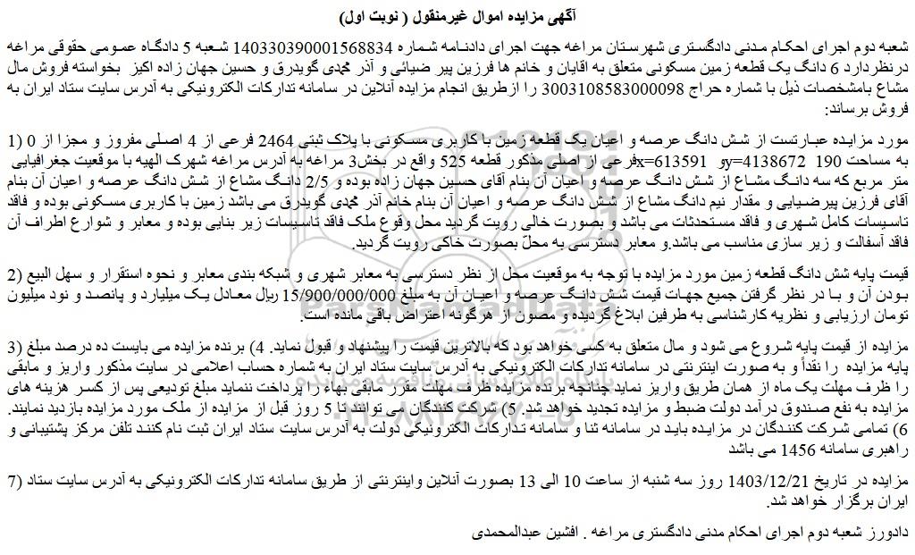 شعبه دوم اجرای احکام مدنی دادگستری شهرستان مراغه جهت اجرای دادنامه شماره 140330390001568834 شعبه 5 دادگاه عمومی حقوقی مراغه درنظردارد 6 دانگ یک قطعه زمین مسکونی متعلق به اقایان و خانم ها فرزین پیر ضیائی و آذر محمدی گویدرق و حسین جهان زاده اکیز  بخواسته فروش مال مشاع بامشخصات ذیل با شماره حراج 3003108583000098 را ازطریق انجام مزایده آنلاین در سامانه تدارکات الکترونیکی به آدرس سایت ستاد ایران به فروش برساند: