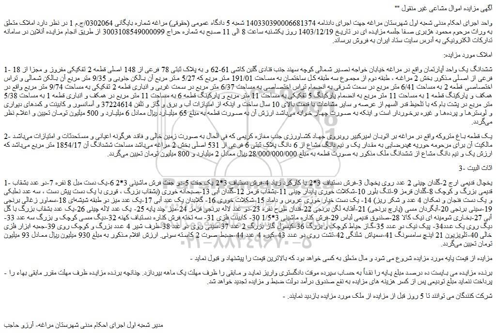 مزایده ششدانگ یک واحد آپارتمان و..., مزایده ششدانگ یک واحد آپارتمان و...