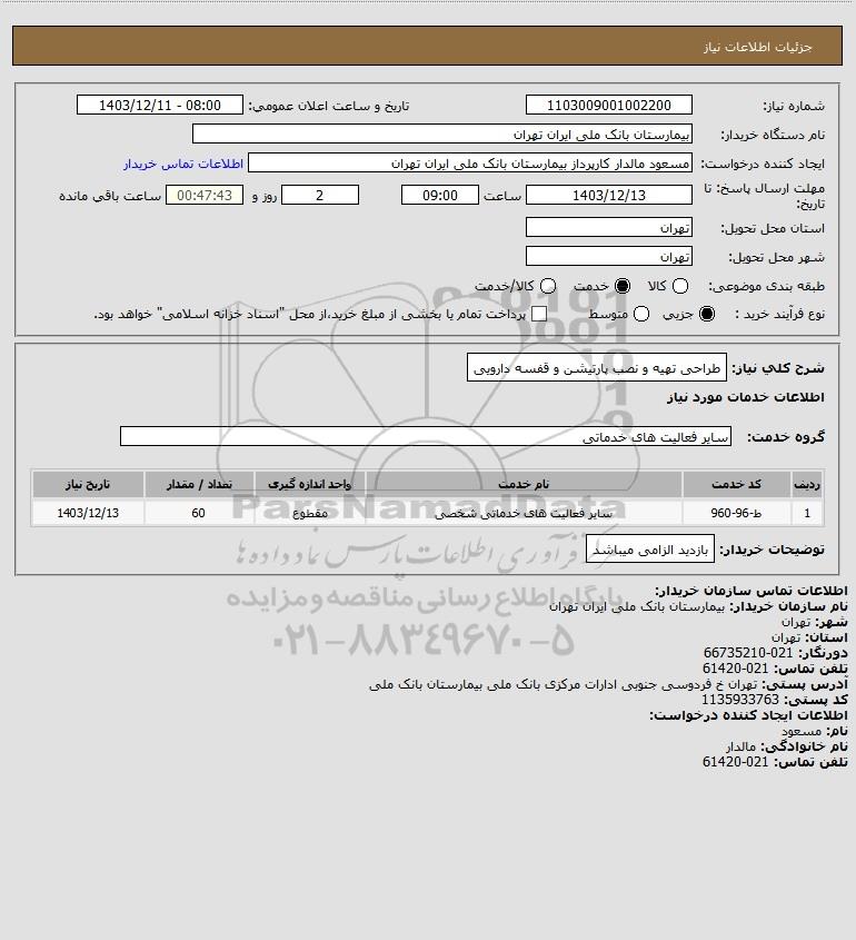 شرح کلی نیاز: طراحی تهیه و نصب پارتیشن و قفسه دارویی