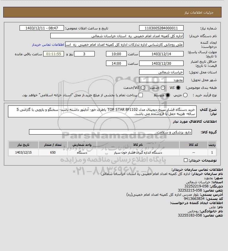 | 1 | -- | دستگاه اندازه گیری فشار خون سیار | دستگاه | 650 | 1403/12/15 |