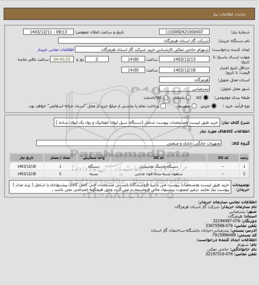 نام دستگاه خریدار:شرکت گاز استان هرمزگان