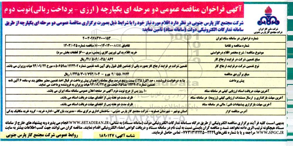 شرکت مجتمع گاز پارس جنوبی در نظر دارد اقلام مورد نیاز خود را با شرایط ذیل بصورت برگزاری مناقصه عمومی همزمان با ارزیابی کیفی یکپارچه دو مرحله ای از طریق سامانه تدارکات الکترونیکی دولت سامانه ستاد تامین نماید