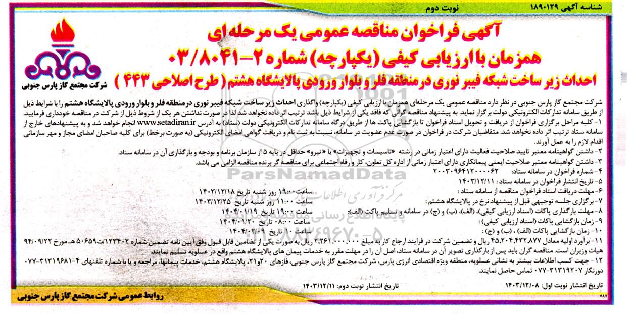 آگهی فراخوان مناقصه عمومی یک مرحله ای همزمان با ارزیابی کیفی (یکپارچه) شماره 2-03/8041 ؟ نوبت دوم