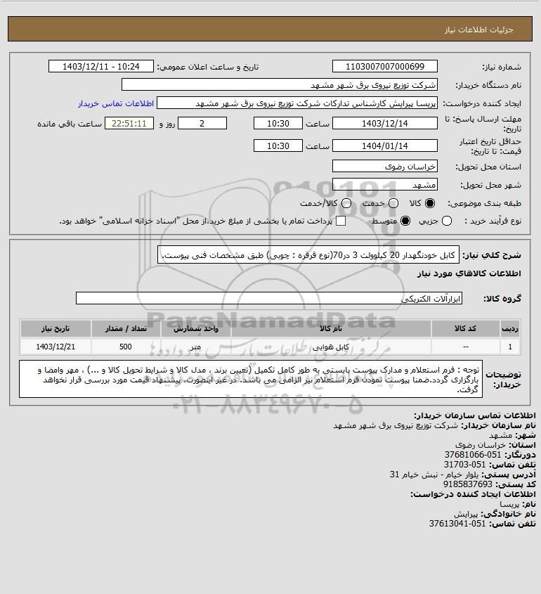 شرح کلی نیاز: کابل خودنگهدار 20 کیلوولت 3 در70(نوع قرقره : چوبی) طبق مشخصات فنی پیوست.
