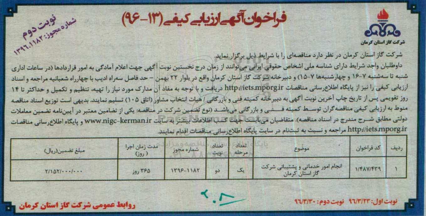 | 1/487/439 | انجام امور خدماتی و پشتیبانی شرکت گاز استان کرمان |