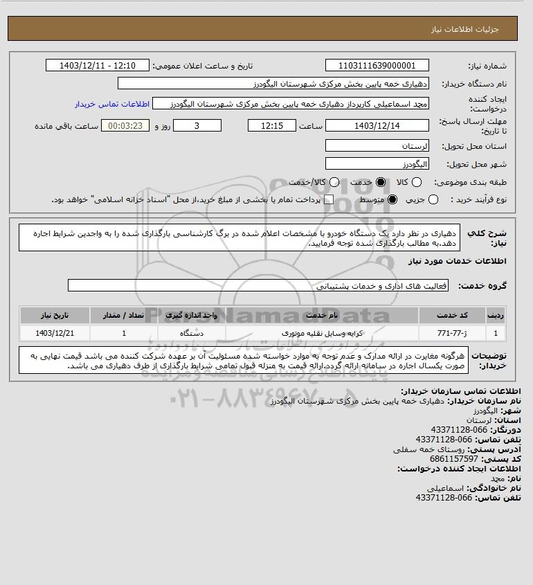 شرح کلی نیاز: دهیاری در نظر دارد یک دستگاه خودرو با مشخصات اعلام شده در برگ کارشناسی بارگذاری شده را به واجدین شرایط اجاره دهد.به مطالب بارگذاری شده توجه فرمایید.