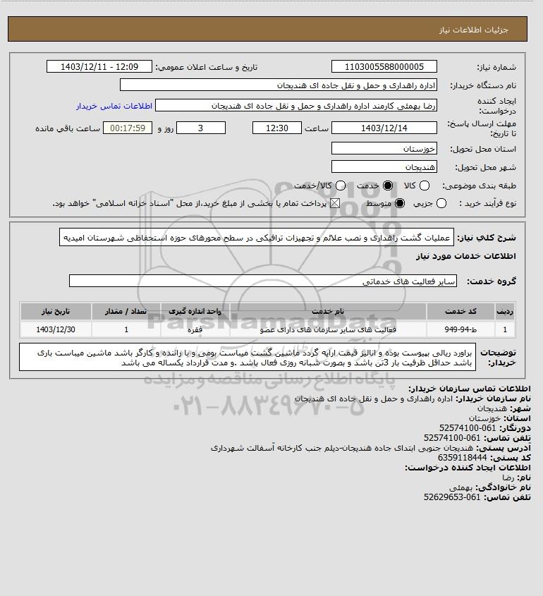 شرح کلی نیاز: عملیات گشت راهداری و نصب علائم و تجهیزات ترافیکی در سطح محورهای حوزه استحفاظی شهرستان امیدیه